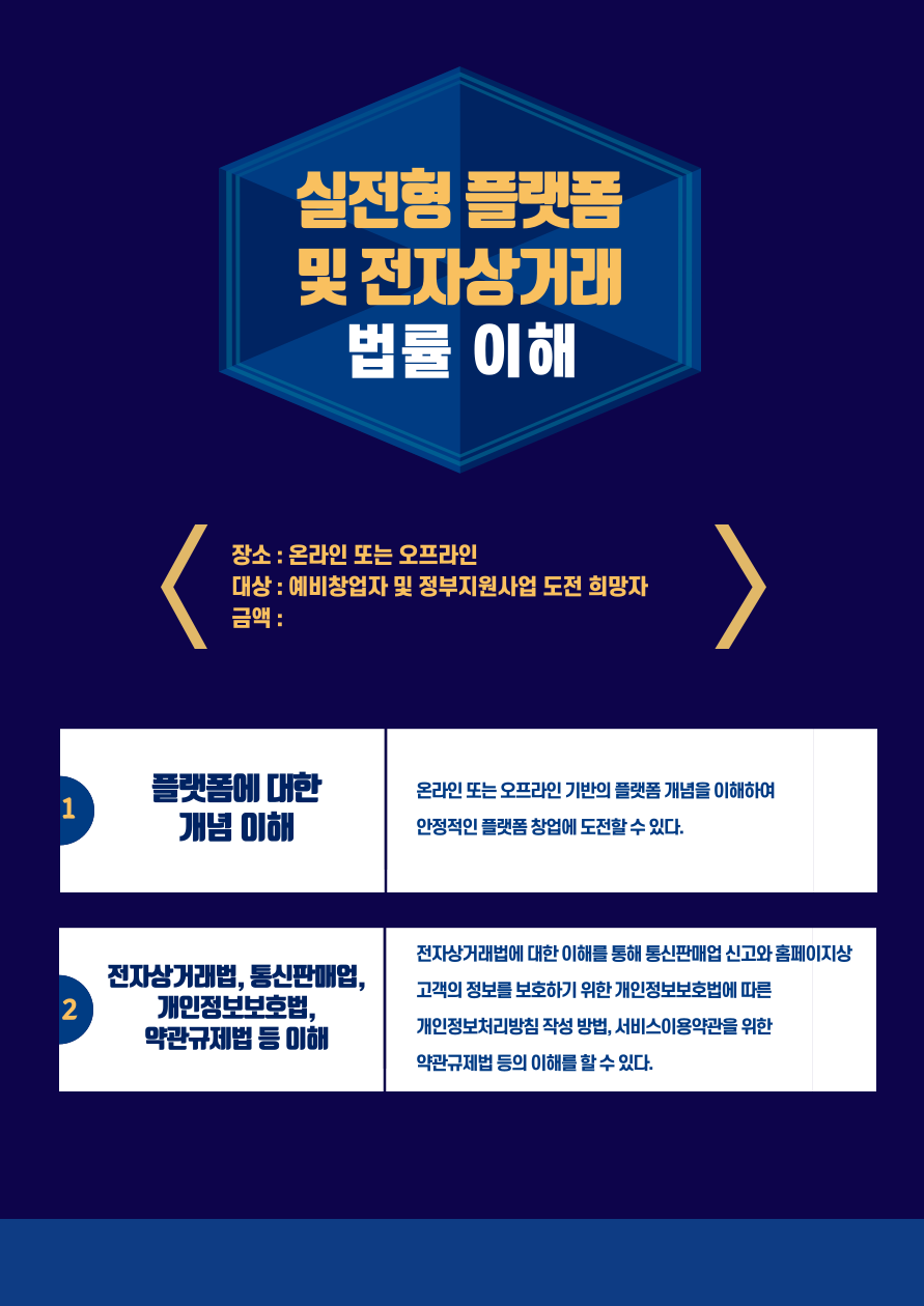 | 강의내용 | 1. 플랫폼에 대한 개념 이해 온라인 또는 오프라인 기반의 플랫폼 개념을 이해하여 안정적인 플랫폼 창업에 도전할 수 있다. 2. 전자상거래법, 통신판매업, 개인정보보호법, 약관규제법 등 이해 전자상거래법에 대한 이해를 통해 통신판매업 신고와 홈페이지상 고객의 정보를 보호하기 위한 개인정보보호법에 따른 개인정보처리방침 작성 방법, 서비스이용약관을 위한 약관규제법 등의 이해를 할 수 있다. |