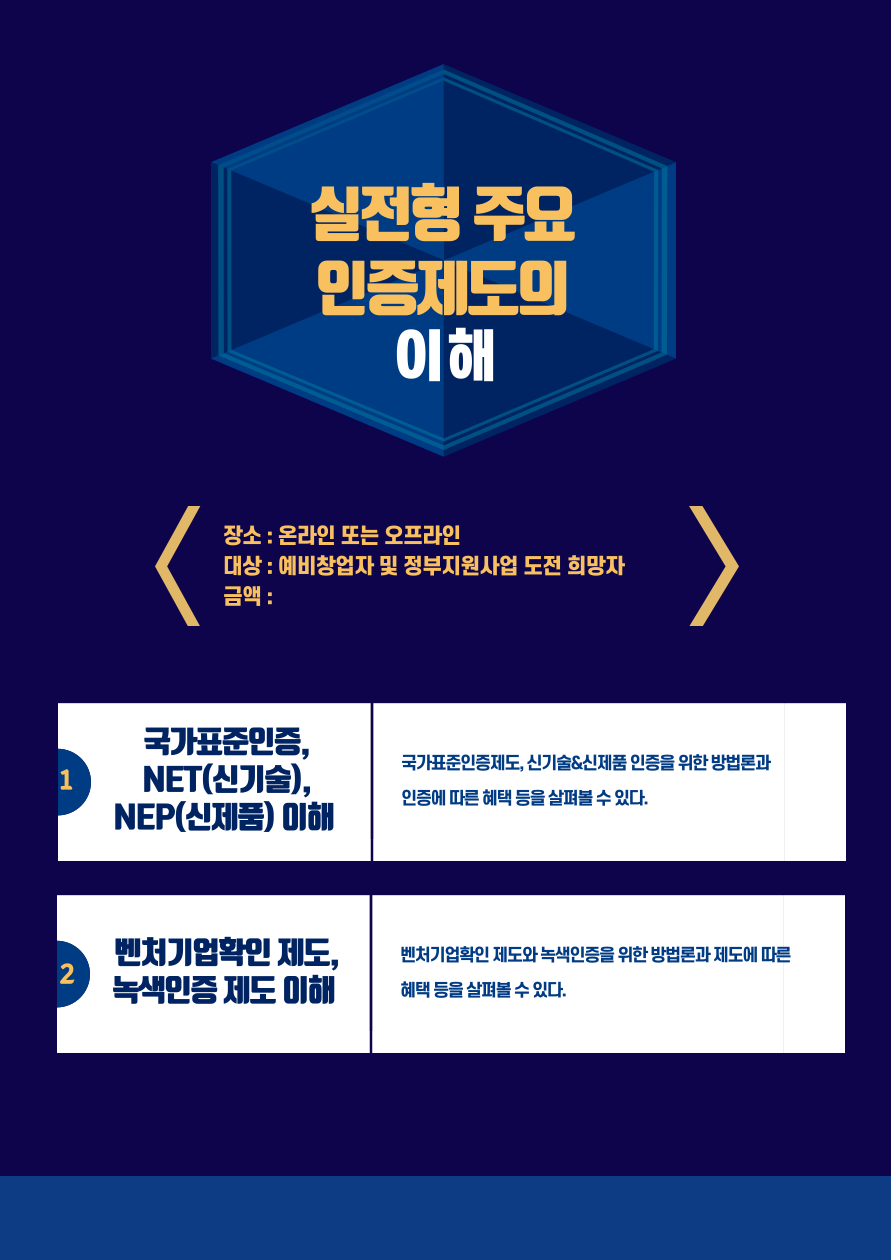 | 강의내용 | 1. 국가표준인증, NET(신기술), NEP(신제품) 이해 국가표준인증제도, 신기술&신제품 인증을 위한 방법론과 인증에 따른 혜택 등을 살펴볼 수 있다. 2. 벤처기업확인 제도, 녹색인증 제도 이해 벤처기업확인 제도와 녹색인증을 위한 방법론과 제도에 따른 혜택 등을 살펴볼 수 있다. |